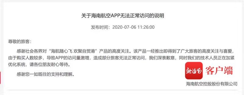 新海南客戶端、南海網(wǎng)、南國都市報7月6日消息(記者 蘇靚 )7月6日上午,海南航空“海航隨心飛,歡聚自貿(mào)港”機票產(chǎn)品正式對外發(fā)售,由于產(chǎn)品優(yōu)惠力度大吸引力大,外加海南離島免稅新政的“加持”,11點30分開售時間還未到,此次活動平臺海南航空客戶端就已經(jīng)被“擠爆”,網(wǎng)友紛紛反映無法正常登錄。海南航空官方微博隨后連發(fā)布公告對此問題進行了解釋,并表示首批飛行套票已經(jīng)售罄,第二批4000張將于7日上午11點30分開售。
