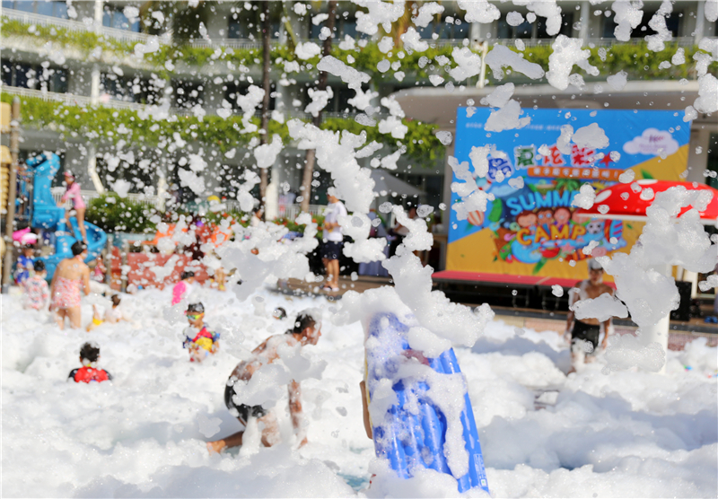 現(xiàn)場的開營也別具一格,酒店摒棄中規(guī)中矩的儀式,讓孩子們與家長一起進入炫彩泳池中共同開營,不僅能營造濃郁的海島度假氛圍,也讓“坐不住”的孩子釋放了天性。酒店在本次開營的營銷方面也用足了線上營銷的打法,營長抖音直播,KOL跨界直播,抖音視頻營銷導(dǎo)流,網(wǎng)紅現(xiàn)場打卡,以直播+視頻,借助網(wǎng)紅大流量提升酒店曝光度。