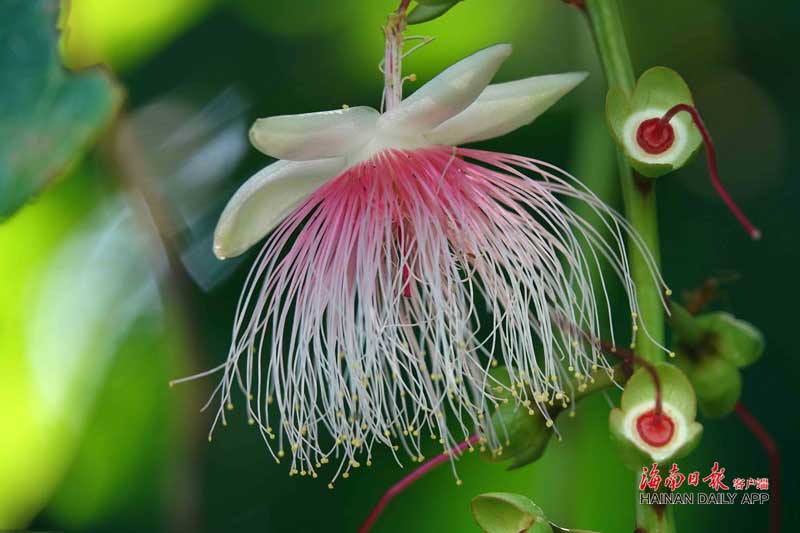 走在玉蕊林中,高大盤曲的玉蕊樹姿態(tài)優(yōu)雅,每一根樹枝上都有一枝或多枝花序,長長的花序像藤條一樣垂吊下來,開花時(shí),長長的花蕊突然從花苞中炸裂,探出虬曲的淺粉色花絲,彎彎曲曲的花絲逐漸延展伸直,一朵朵粉雕玉琢的瓊?cè)铿幓魈K般串串搖曳在風(fēng)中,美不勝收。