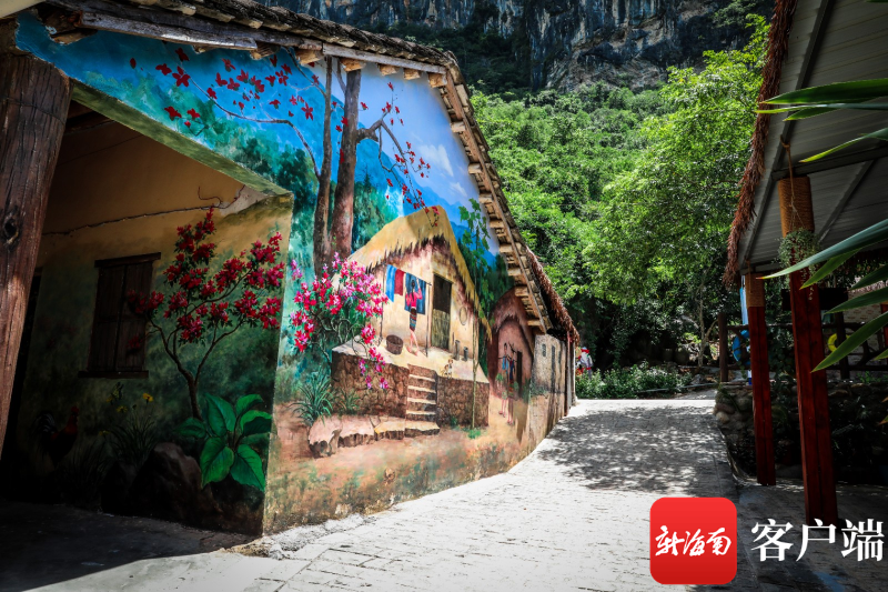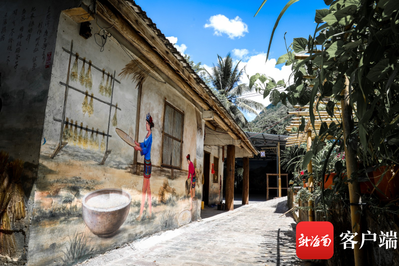 三派村民宅景觀,將墻繪藝術(shù)與當(dāng)?shù)刈匀弧⑷宋沫h(huán)境、黎鄉(xiāng)故事相互結(jié)合,打造了“流動(dòng)的黎族文化博物館”。記者 姚皓 攝