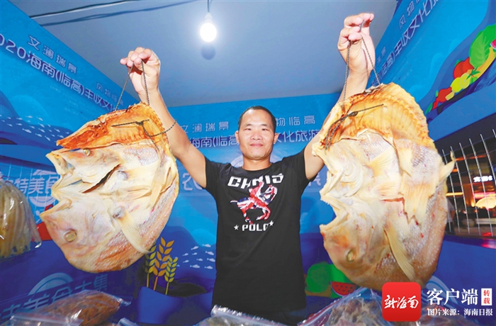 在農特美食大集上,漁民展示海產品紅魚。海南日報記者 陳元才 攝