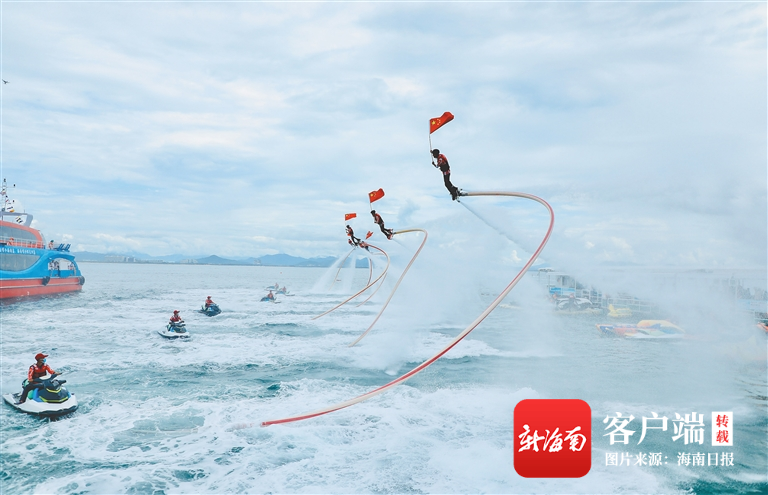 10月1日,三亞蜈支洲島旅游區精心編排水上表演,營造濃厚的節慶氛圍,吸引了眾多游客。 海南日報記者 武威 通訊員 吳平湖 圖/文