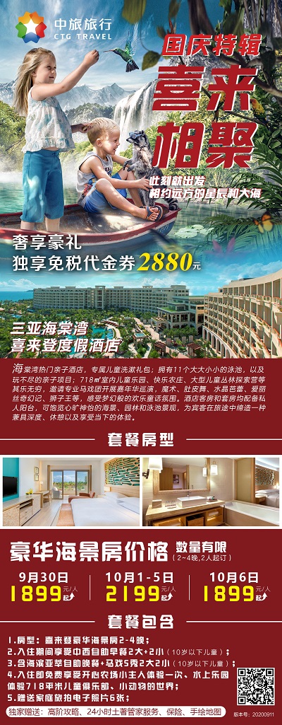 中旅旅行還攜手三亞海棠灣喜來登度假酒店,為親子家庭提供出游的下榻優選。旅客可以享受優惠價格,體驗玩不盡的親子項目,在兒童樂園、快樂農莊、兒童叢林探索營等感受夢幻童話氛圍,24小時管家服務將為您帶來全方位的私密服務。