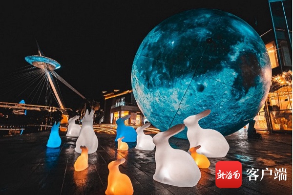 玉兔沉浸展,游客能觀賞到一輪淡藍色的“超級月亮”在三亞云戒橋畔升起,與夜幕下流光溢彩的云戒橋交相輝映,感受傳統意蘊與潮流文化相互碰撞。