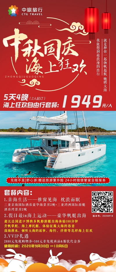 假期期間,中旅旅行推出了“海上狂歡”自由行套餐路線,游客可以在豪華海景房下榻,推窗見海、枕浪而眠,在假日開展最“in”的海上運動,乘坐法國進口博納多帆船游艇出海,升帆掌舵,體驗征服大海的恣意與刺激,深海潛水、聆聽海的故事、海釣、浮潛等特色海上運動等您“打卡”!