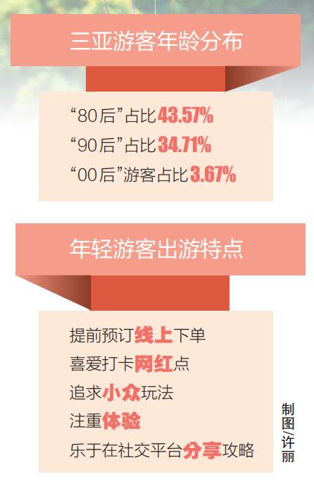 疫情防控常態化后,三亞作為熱門旅游目的地,各項旅游指標更是創下新高。從游客年齡分布情況來看,“80后”占比最高,為43.57%;“90后”占比34.71%;此外“00后”游客占比3.67%。相較于去年同期,“80后”“90后”年輕游客的比例有了顯著增長。
