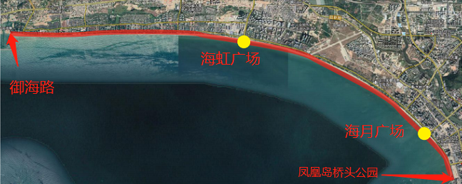 三亞灣功能提升項(xiàng)目鄰近三亞市中心,三亞灣路南側(cè)綠化帶,西起御海路東至鳳凰島橋頭公園(御海路—海坡六橫巷—海虹廣場(chǎng)—海月廣場(chǎng)—鳳凰島橋頭公園)。總長(zhǎng)約15公里,平均寬度約為50米。總規(guī)劃面積為1125畝(75公頃),屬濱海帶狀公園。