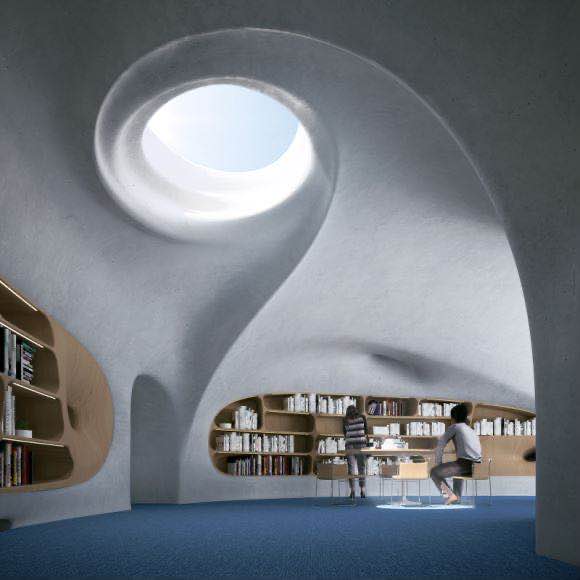 “云洞圖書(shū)館”的建筑靈感其實(shí)是來(lái)源于蟲(chóng)洞,一個(gè)時(shí)空的概念,打造的不僅是蟲(chóng)洞外形,也是類(lèi)似于蟲(chóng)洞的空間,讓人在空間里面有穿越時(shí)空和超越現(xiàn)實(shí)的感覺(jué)。整個(gè)建筑是曲面的、復(fù)雜的造型,大大小小的蟲(chóng)洞就像多維的時(shí)間隧道,整體是非常有趣味而且神秘的空間體驗(yàn)。
