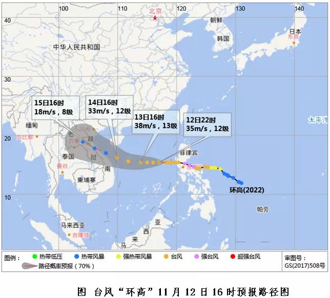 海南省氣象局2020年11月13日07時30分繼續(xù)發(fā)布臺風(fēng)三級預(yù)警:今年第22號臺風(fēng)“環(huán)高”,13日07時中心位于北緯15.2度、東經(jīng)115.7度,也就是在距離海南省三沙市(西沙永興島)東偏南方向約405公里的南海中東部海面上,中心附近最大風(fēng)力12級(33米/秒),七級風(fēng)圈半徑200~280公里,十級風(fēng)圈半徑60~80公里。預(yù)計,“環(huán)高”將以每小時20公里左右的速度向偏西方向移動,強度變化不大或略有增強,13日下午到夜間先后掠過中沙及西沙群島部分島嶼,14日白天開始強度逐漸減弱,并將轉(zhuǎn)向西偏北方向移動,向越南中北部沿海靠近。受“環(huán)高”和冷空氣共同影響,13日~15日,我省海域?qū)⒆詵|向西出現(xiàn)強風(fēng)雨;13日夜間~15日,本島將有強風(fēng)雨天氣。