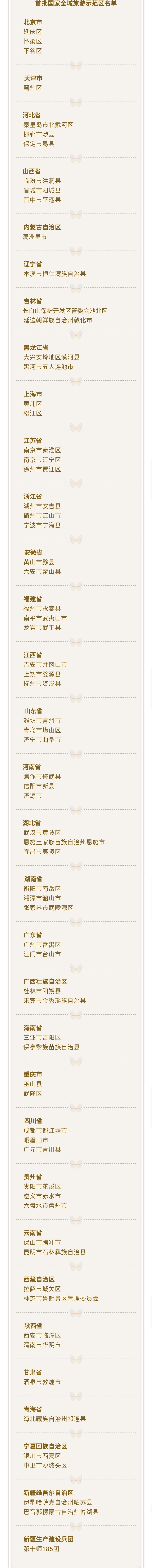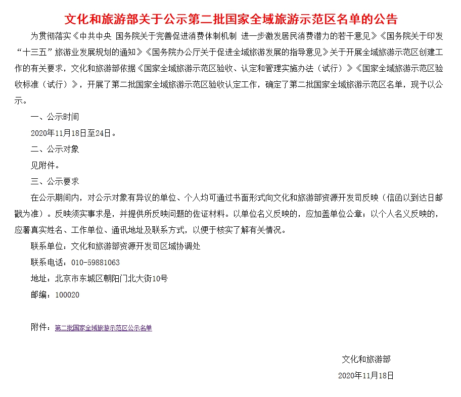 為貫徹落實《中共中央 國務院關于完善促進消費體制機制 進一步激發居民消費潛力的若干意見》《國務院關于印發“十三五”旅游業發展規劃的通知》《國務院辦公廳關于促進全域旅游發展的指導意見》關于開展全域旅游示范區創建工作的有關要求,文化和旅游部依據《國家全域旅游示范區驗收、認定和管理實施辦法(試行)》《國家全域旅游示范區驗收標準(試行)》,開展了第二批國家全域旅游示范區驗收認定工作,確定了第二批國家全域旅游示范區名單,現予以公示。