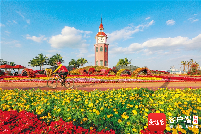 ??谖骱0队^海臺鐘樓,一簇簇鮮花裝扮,吸引了不少市民游客前來健身打卡。海南日報記者 陳元才 攝