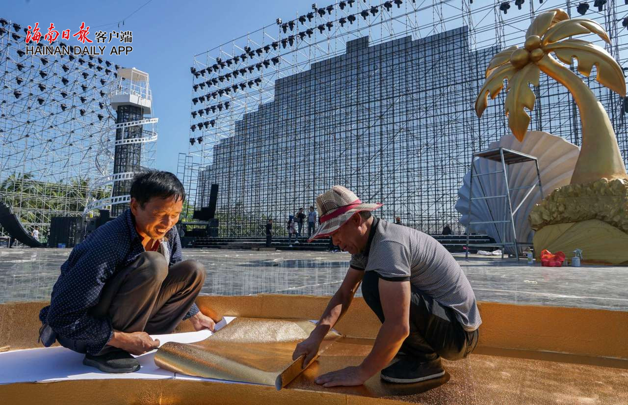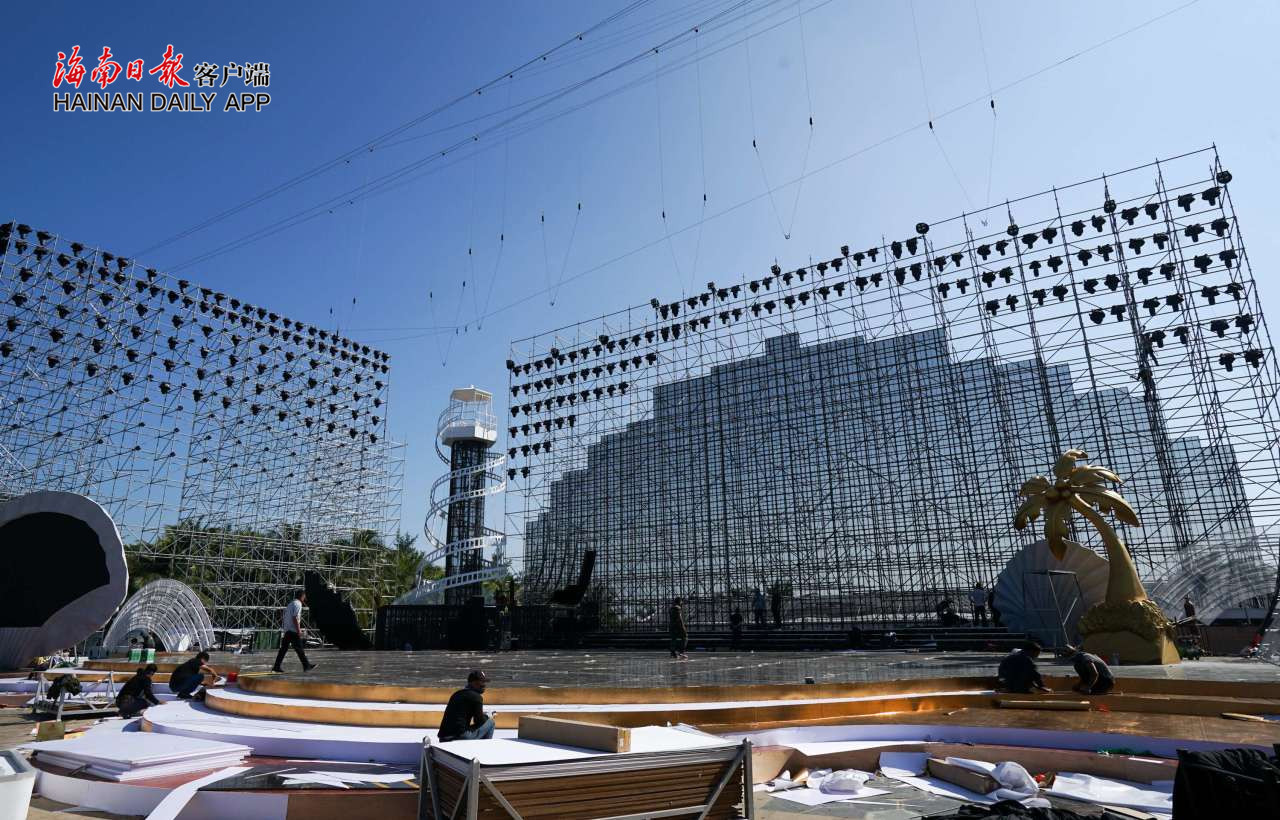 12月3日,在三亞市海棠廣場,施工人員正在加緊布置第三屆海南島國際電影節開幕式舞臺。 本報記者 武威 攝