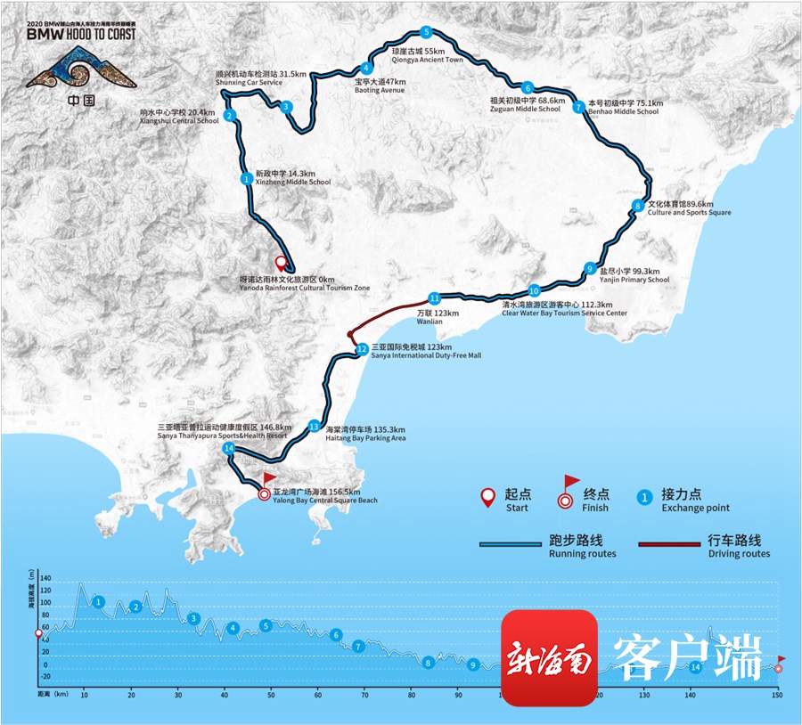據組委會介紹,2020BMW越山向海人車接力海南年終巔峰賽將于12月12日零點準時起跑,比賽將持續24個小時,12月12日24:00賽事結束。活動將從保亭呀諾達雨林文化旅游區出發,歷經晝夜156.5公里奔跑,最終抵達“天下第一灣”亞龍灣廣場海灘。選手可以盡情領略海南獨有的熱帶雨林和海濱風光,而沿途豐富的民俗舞蹈、傳統節慶及賽道補給更可以讓參賽跑友深入感受海南獨特的少數民族風情和當地人文文化。