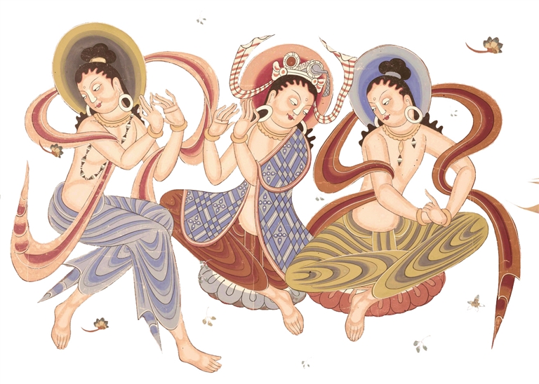 在佛教的“凈土勝地”中,音樂與舞蹈是不可或缺的要素。據統計,在現存敦煌石窟中保留有舞樂題材的洞窟共有236個,其中繪有各種類型的樂隊約500組,且大多伴有舞蹈場面;所出現的各種類型的樂器計有44種4500余件之多。在全世界的壁畫歷史中,就反映的樂舞數量之多、品類之豐富、時間跨度之長而言,敦煌壁畫都是無與倫比的。