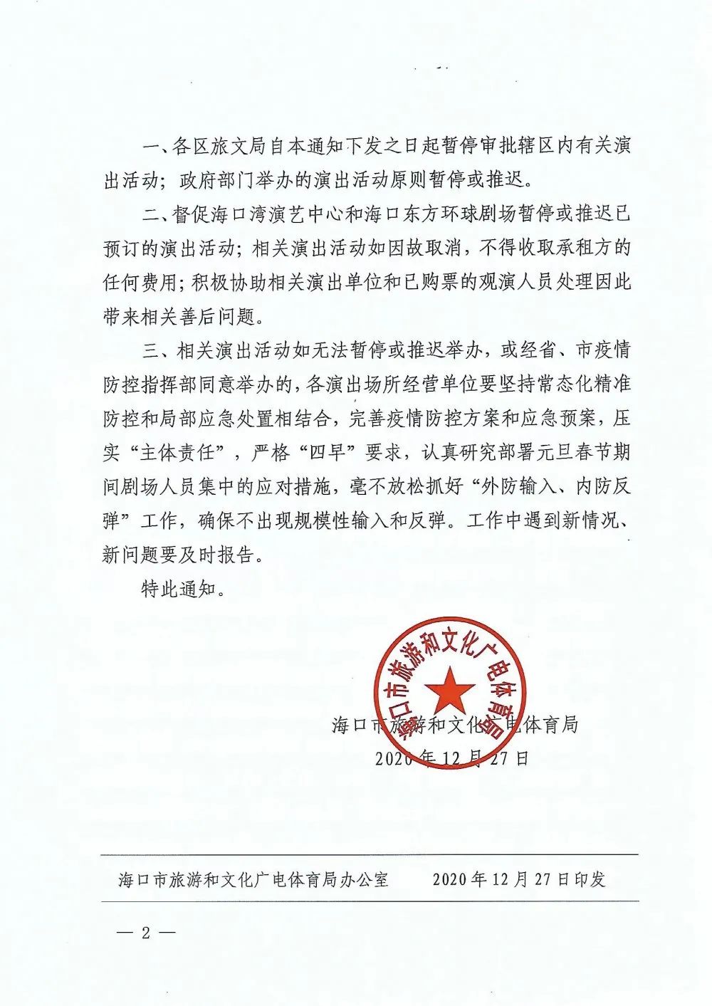根據(jù)海口市人民政府防疫工作統(tǒng)一要求以及海口市旅游和文化廣電體育局《關(guān)于進(jìn)一步加強(qiáng)演出場(chǎng)所疫情防控工作的通知》文件指示,為更好保障所有觀眾及工作人員生命安全和身體健康,原定于2020年12月31日、2021年1月1日上演的大型民族舞劇《醒·獅》將延期演出,延期的演出我們將為觀眾提供退票服務(wù)。延期上演時(shí)間將另行通知。