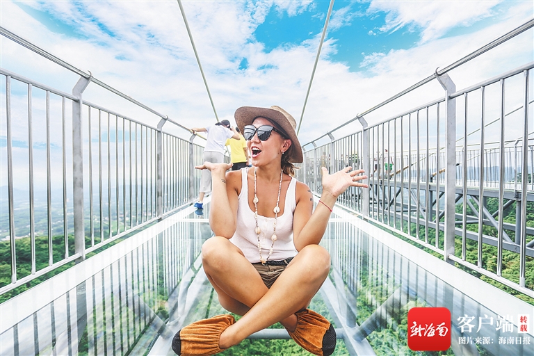 外國游客體驗呀諾達景區高空玻璃棧道。 武昊 攝