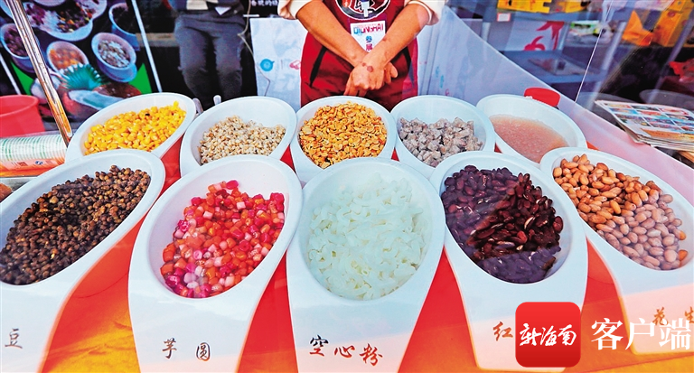 瓊海涼爽展位擺上了綿綿冰、榴蓮、椰子凍、芒果、南瓜露等系列特色小吃;大路小黃牛肉粉展位,一口大大的鐵鍋里正熬著鮮湯,遠遠就聞到香氣飄來;還有雜糧糕、鮮椰絲益母草粑、脆皮斑斕卷、斑斕糕、紅燒乳鴿、嘉積鴨、溫泉鵝……瓊海有名的特色美食小吃應(yīng)有盡有。“沒想到在海口也能吃到這些瓊海美食小吃,真不錯,我去瓊海旅游時就吃過一些,至今還念念不忘哩!”在海口生活的“候鳥”老人吳先生,上午看到展銷會的消息,下午就趕過來買了一些。