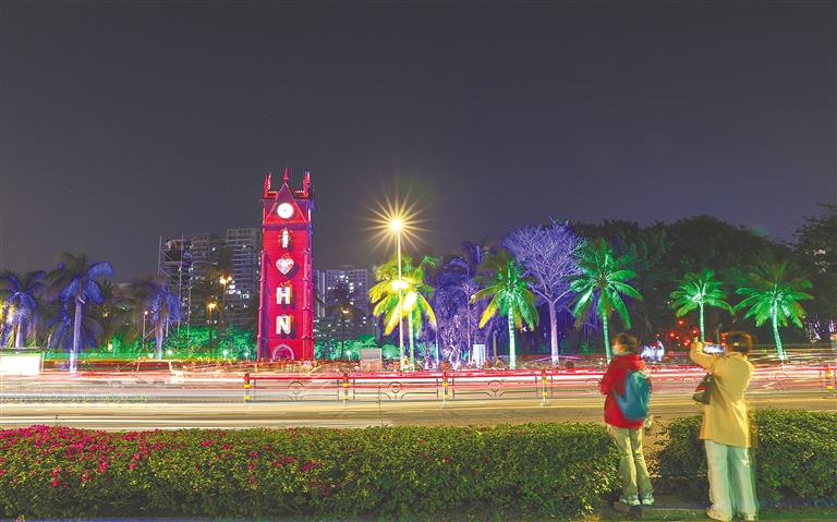 1月2日晚,一場燈光秀在海口鐘樓舉辦,吸引路人駐足觀看。海南日報記者 李天平 攝