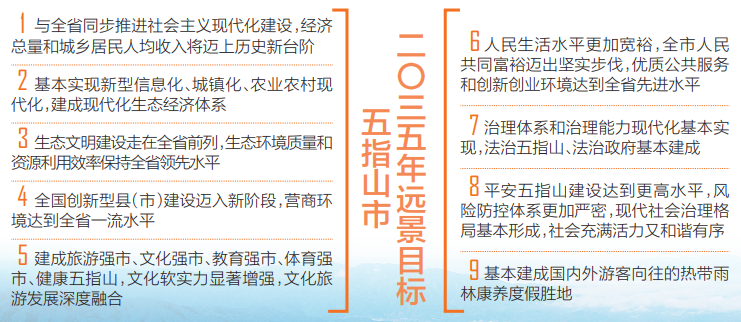 《建議》指出,“十四五”時期,五指山市要緊緊圍繞“生態核心區”戰略定位,積極融入海南自由貿易港建設,充分發揮資源環境優勢,爭創海南中部中心城市,加快建設熱帶雨林康養度假勝地,將五指山打造成為海南熱帶雨林國家公園的靚麗名片,爭創國家生態文明試驗區建設生動范例。