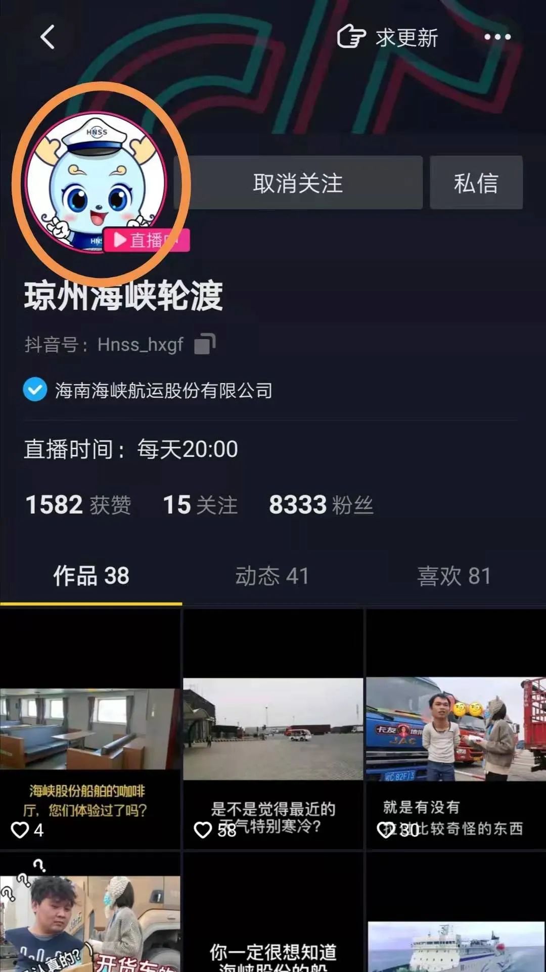 三、通過關注“瓊州海峽輪渡”抖音號,點擊頭像觀看新海港、秀英港車場及道路全天24小時實況直播。