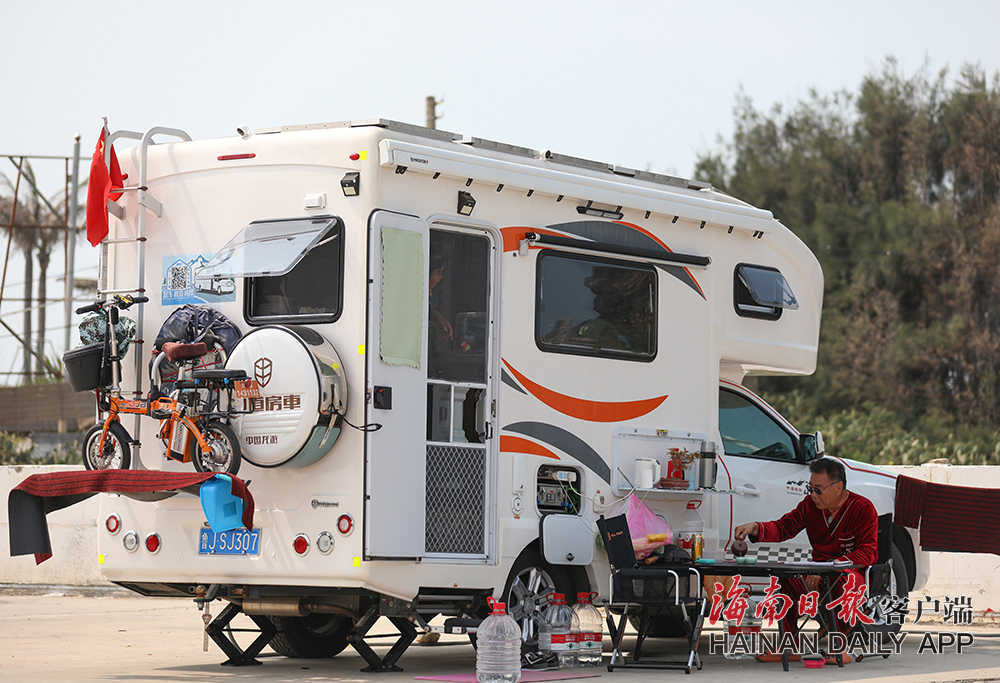 2月16日,在東方市魚鱗洲風景區(qū),房車車主在海風吹拂下品茶。