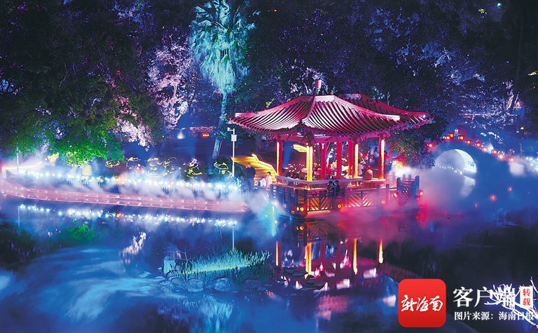 每晚18:00—24:00,燈光亮起,紅墻內滿園火樹銀花,夢幻綺麗……自2月1日起,到海口五公祠夜游已成為海口市民游客夜生活的新選擇。