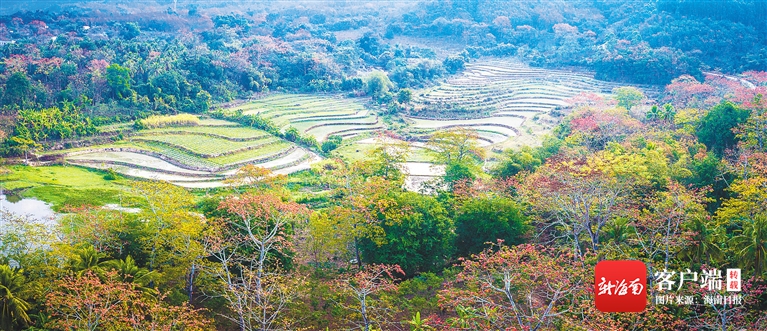 2月21日上午,昌江黎族自治縣七叉鎮(zhèn)寶山村周邊的木棉花競相綻放,與附近梯田中的秧苗交相輝映,宛如一幅田園畫卷,令前來觀賞的游客流連忘返。特約記者 吳文生 攝