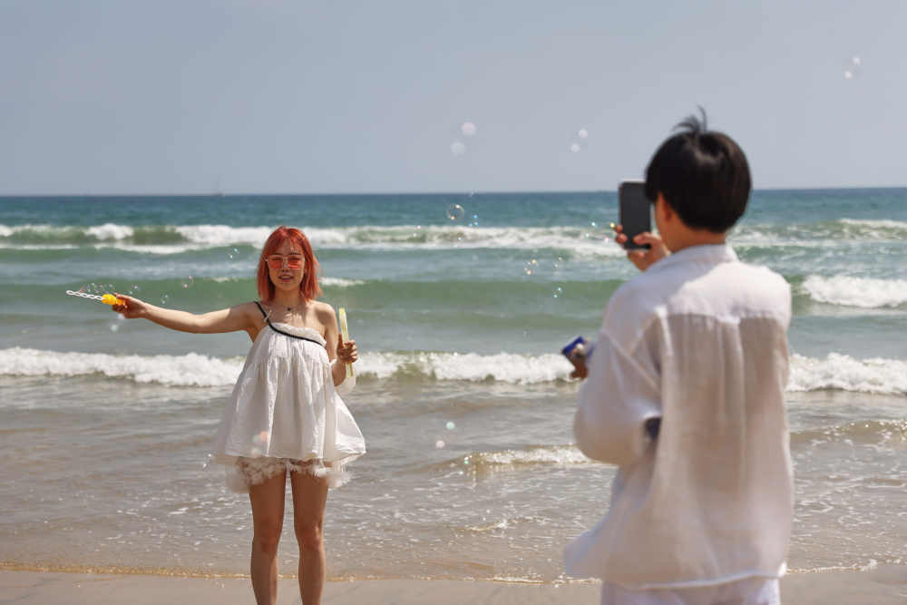 ↑2月21日,游客在海南萬寧石梅灣海邊游玩。