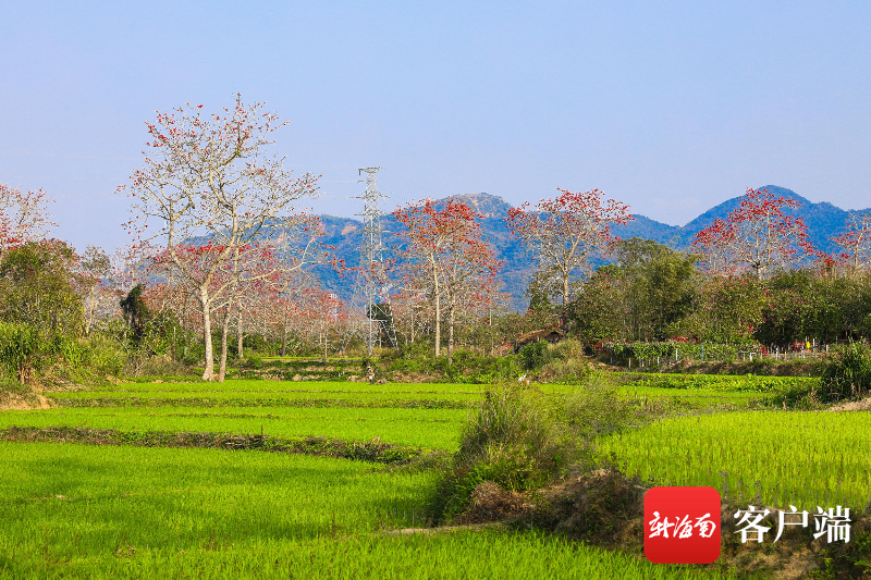 清晨,走進(jìn)排岸村,綿延1.6公里的木棉紅美不勝收,“火車木棉紅”景觀更是一絕。如果不想走太遠(yuǎn),那就沿著村里的木棉棧道走一圈。木棉花開恰逢春來,木棉樹下,勤勞的黎家人俯身插上秧苗,木棉稻田,花紅稻綠,好一幅瓊島春耕圖。