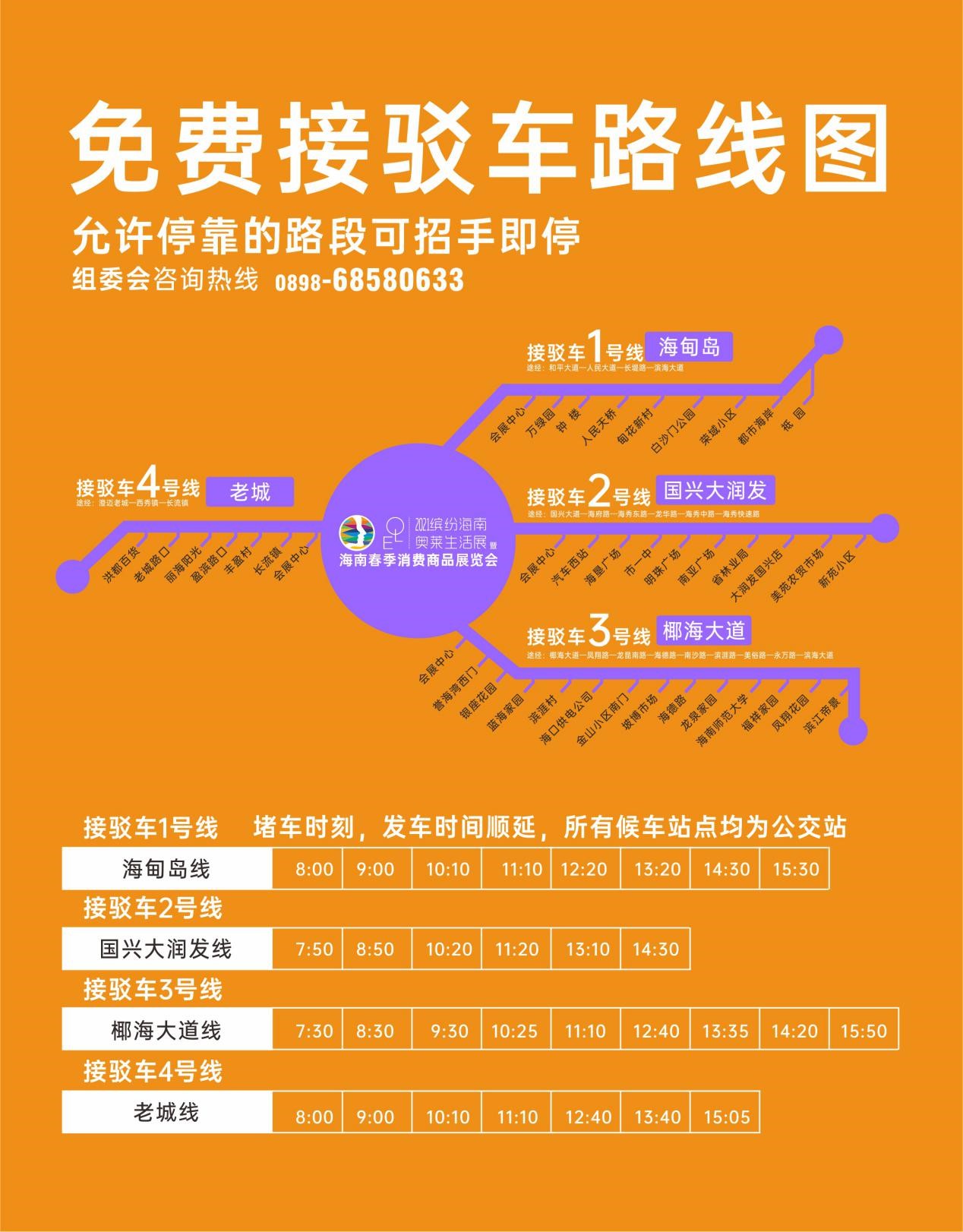 2021年3月17日—21日展會期間,展會組委會除了在展館規劃足夠停車位以外,還特別提供從海南國際會展中心往返??谑袇^及澄邁的免費接駁服務,具體包括海甸島線、國興大潤發線、椰海大道線、老城線,以方便消費者出行。