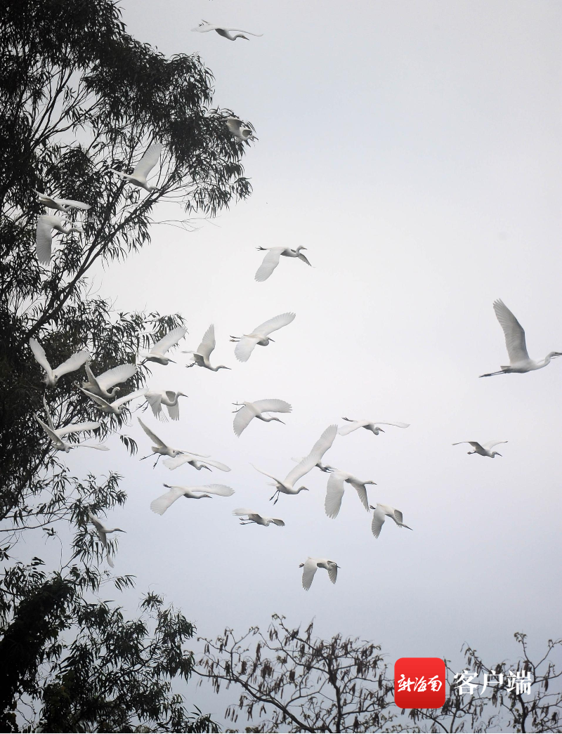3月23日,三亞學(xué)院白鷺溪畔,成群結(jié)隊的白鷺飛舞嬉戲。記者 沙曉峰 攝