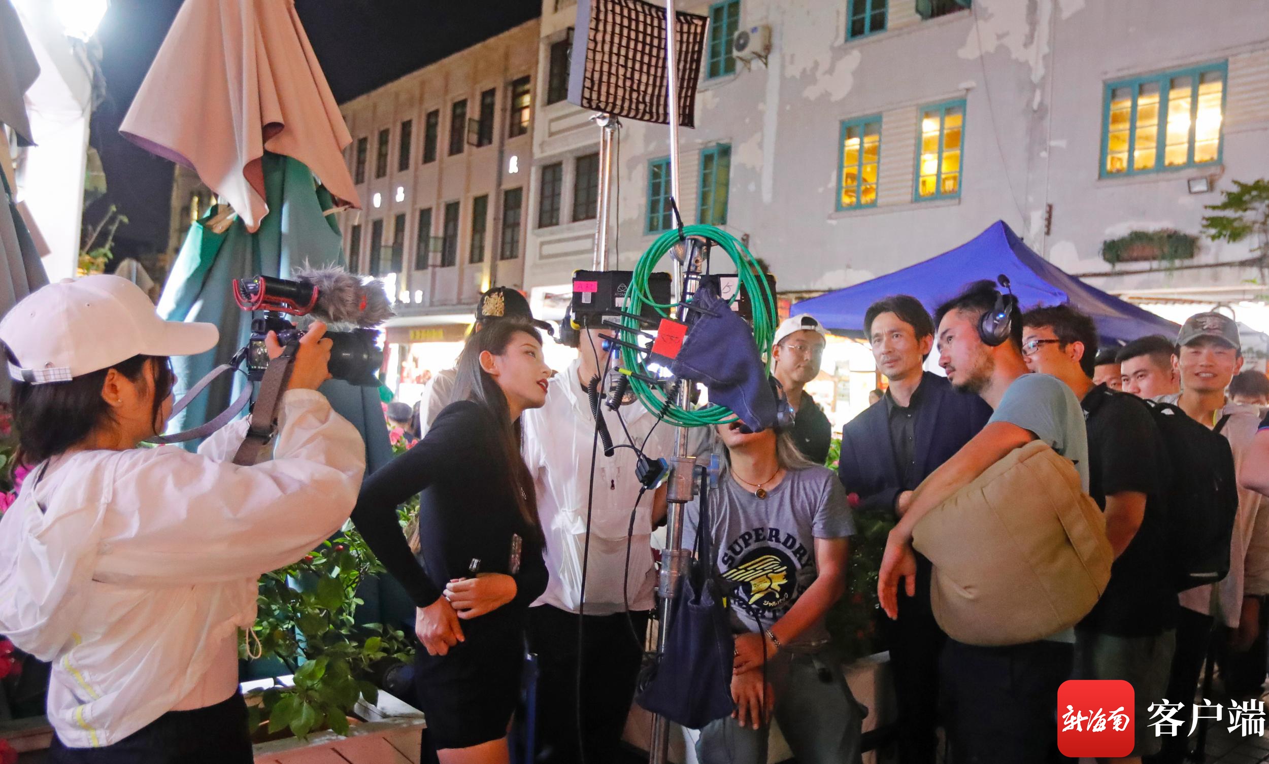 攝制組在騎樓取景。記者 汪承賢 攝