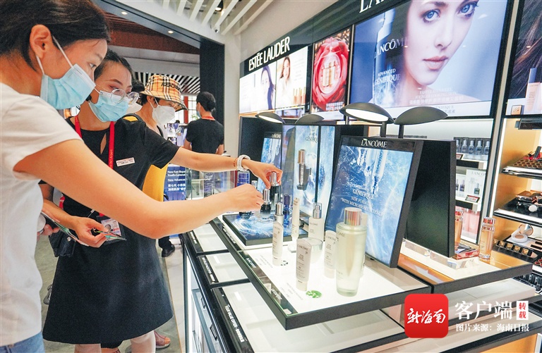 在位于海口日月廣場的海控(全球)精品免稅城,購買免稅品的游客人來人往,十分熱鬧,熱門單品專柜前排起長龍,不少消費者一邊拿出手機比對有稅市場的行情,一邊計算免稅店的折扣、積分等優惠。
