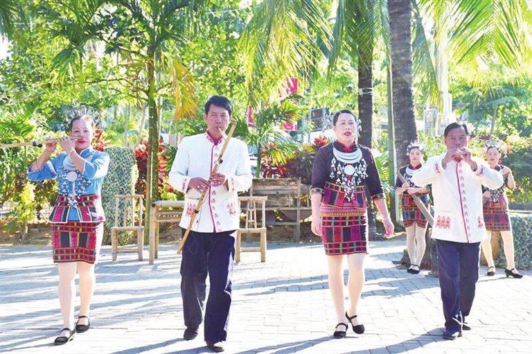 吉陽區中廖村黎家小院,穿著黎族服裝的村民演員在給游客表演黎族歌舞。 三亞日報記者 陳聰聰 攝