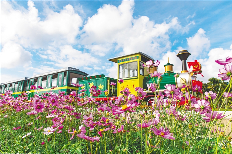 新屋成行、石板路縱橫,延綿的花海恣意綻放……在龍壽洋萬畝田野公園里,可以體驗最新的小火車項目。在四月芳菲天,乘坐在小火車上徐徐前行,花海的繽紛盡收眼底,即便是一個人自拍,也可以收獲色彩高飽和的美麗照片。