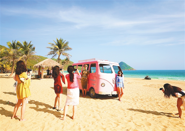 粉紅巴士、白色老爺車、七彩沙灘椅、泡泡屋、秋千……以藍天碧海和潔白沙灘為背景,清新文藝而又充滿萌感的道具散落其中,南灣猴島南側(cè)的呆呆島成為不少人前來打卡拍照的景點。在小紅書、微博和抖音等各大網(wǎng)絡(luò)平臺中,常常可以看到網(wǎng)友們風(fēng)格清新的美照。每天限流500人,并不是所有團隊客都能上島。