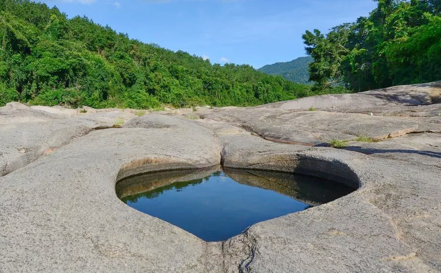 愛心潭因形似心臟而得名。它位于一塊天然的石壁之上,潭面光滑,潭水清澈。直徑2米多,水深約1米5。相傳有一位黎家阿哥為了讓心愛的姑娘有個隱蔽的沐浴之處,整整花了365天在河床上鑿出這個水潭。在黎族人的心里,這是一個有著美好寓意的愛情湖,相傳情侶只要在這沐浴過,便能永生相愛相守、白頭偕老。