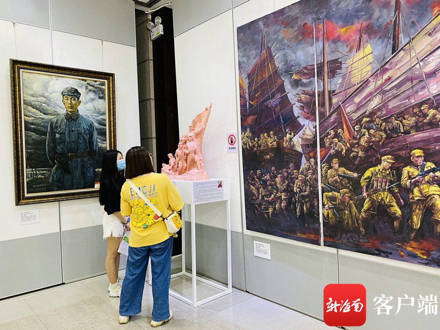紅色經典美術作品展共展出47名藝術家的近80件藝術精品,展品鱗次櫛比地從門前廣場擺入大廳,呈現了一幕幕史實與意境融合、思想與藝術合一的紅色文化故事。其中畫作40多件,有曾祥熙的《牛嶺朝陽》、潘正沂的《姐妹們》、丁孟芳的《古有花木蘭今有娘子軍》等。雕塑作品30多件,有陳學博的《解放海南》、黃黎祥的《永恒的敬禮》等。