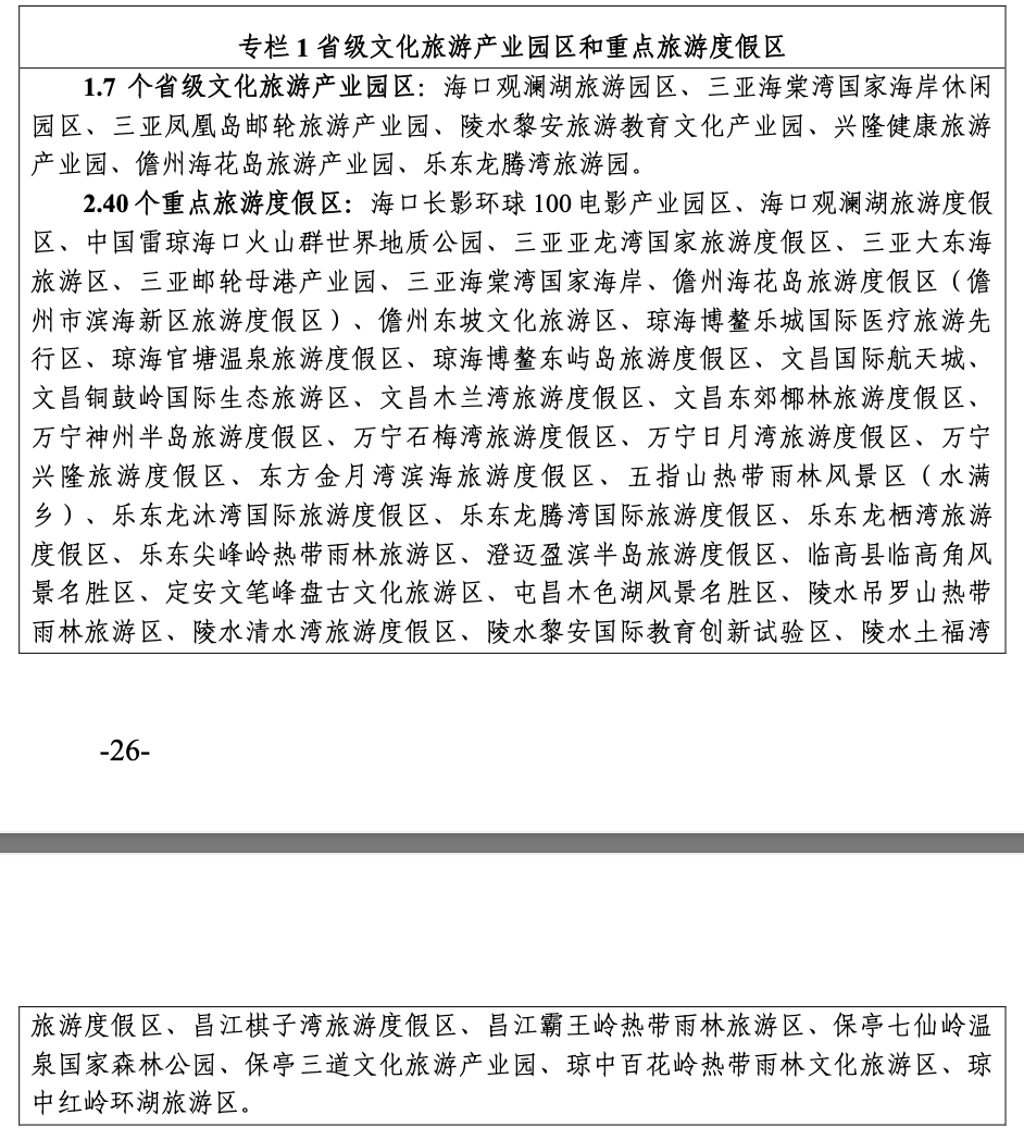 海南還將打造??谟^瀾湖旅游園區、三亞海棠灣國家海岸休閑園區、三亞鳳凰島郵輪旅游產業園、陵水黎安旅游教育文化產業園、興隆健康旅游 產業園、儋州?;◢u旅游產業園、樂東龍騰灣旅游園等7個省級文化旅游產業園區。發展??陂L影環球100電影產業園區、??谟^瀾湖旅游度假區、中國雷瓊海口火山群世界地質公園、三亞亞龍灣國家旅游度假區等40個重點旅游度假區。