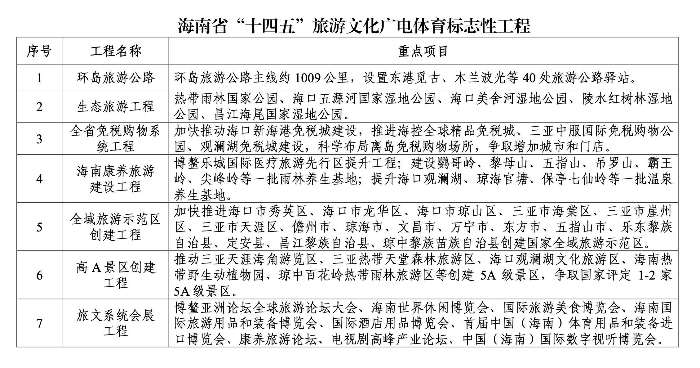 在“十四五”期間,海南將集中力量推進環島旅游公路、生態旅游工程、全省免稅購物系統工程、海南康養旅游建設工程、全域旅游示范區創建工程、高A景區創建工程、旅文系統會展工程、智慧旅文工程、主題公園工程、省會城市十大重點文化工程、博物館發展工程、文化文物品牌工程、國家體育旅游示范區創建工程、體育品牌工程、市縣體育“一場兩館”工程等15項旅游、文化、廣電、體育標志性工程建設工作
