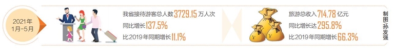 ?繼今年一季度實現開門紅,海南省旅游經濟二季度仍呈現出“淡季不淡”的火熱態勢,使得今年上半年海南省旅游市場持續保持高位——2021年1月-5月,海南省接待游客總人數3729.15萬人次,同比增長137.5%,比2019年同期增長11.1%,旅游總收入714.78億元,同比增長達295.8%,比2019年同期增長66.3%,經濟效益顯著提升。