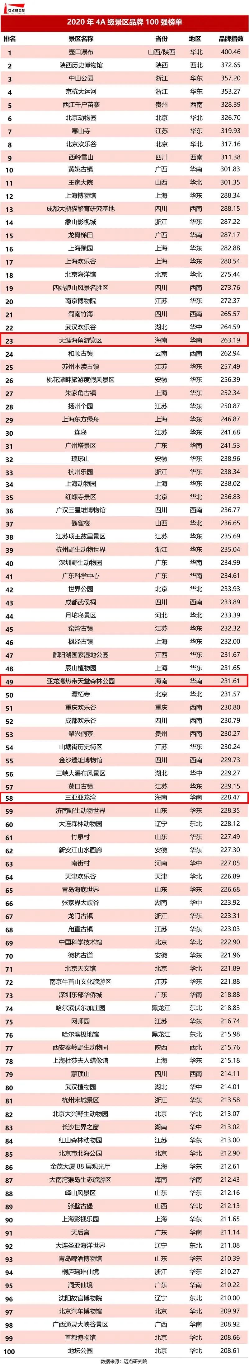 新海南客戶端、南海網(wǎng)、南國(guó)都市報(bào)7月15日消息(記者 沙曉峰)近日,邁點(diǎn)研究院發(fā)布2020年4A級(jí)景區(qū)品牌100強(qiáng)榜單,三亞天涯海角游覽區(qū)、亞龍灣熱帶天堂森林公園、亞龍灣分別以第23、49、58名位列榜單中。