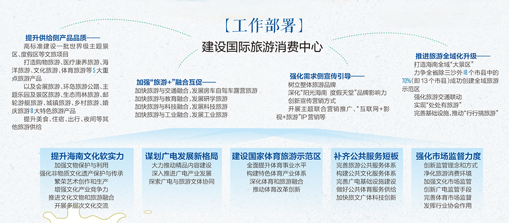 立足海南自貿港建設,圍繞初步建成國際旅游消費中心的發展目標,構建國際知名度假天堂、康養天堂、購物天堂和會展高地,將旅游業打造成為國民經濟支柱型產業