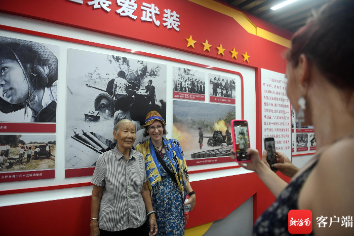 7月22日,海南國際傳播中心的海外傳播官謝敏和第一代女民兵蘇蘭親合影。 記者 沙曉峰攝