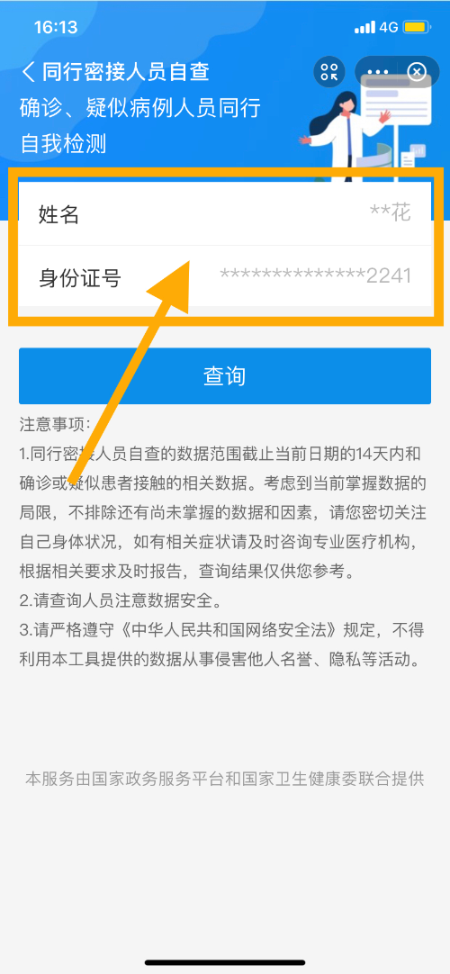 3、進(jìn)入后填寫自己的個人信息,姓名和身份證號,點(diǎn)擊查詢,對應(yīng)的查詢結(jié)果就會展示出來。