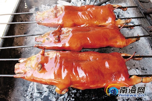 另外,在東方,四更烤乳豬也同樣美名遠播,因原料來源于東方市四更鎮而得名,據傳已有300年的歷史。據說四更農民很久以前從臨高引進了乳豬種,加上自己獨特的飼料和飼養方式,就養出了體小腰直,皮薄肉瘦的四更乳豬。聽一位四更的農民講,小豬出生后他們是有大米煮稀飯,然后伴上小魚來喂小豬。后漸加花生餅、細米糠等,促其長膘。其間還讓乳豬到野外,吃青草,嬉戲玩耍,使其具有野味。