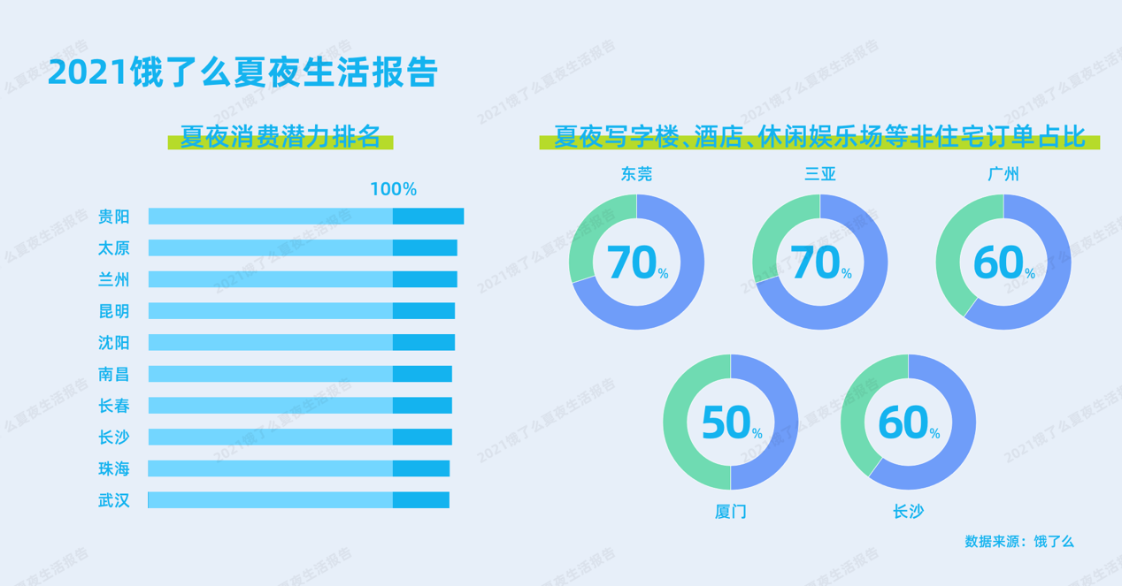 同時,三亞的夜生活場景也相當多元。數據顯示,除了宅家之外,三亞餓了么夜間訂單中近七成來自商場、酒店等多類場景,占比僅次于東莞。其中,來自酒店、度假區內的游客外賣訂單占比近四成,明顯超過了住宅區,也反映出了三亞旅游業的興旺。