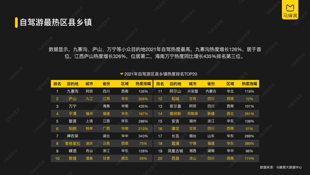 據(jù)馬蜂窩旅游發(fā)布的數(shù)據(jù)顯示,2021年1-7月自駕游熱度明顯超過去年同期;九寨溝、廬山、萬寧等小眾目的地自駕熱度最高,九寨溝熱度同比增長(zhǎng)126%,居于首位、江西廬山熱度同比增長(zhǎng)326%,位居第二、海南萬寧熱度同比增長(zhǎng)435%,位居第三。
