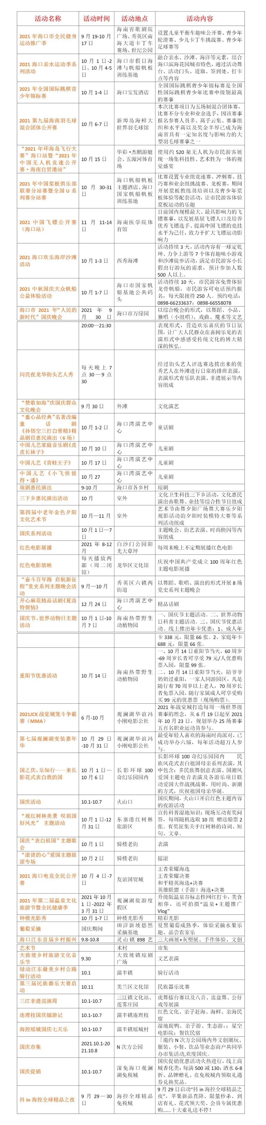 觀瀾湖電影公社國慶7天樂,每天七大主題享不停。國慶七天,每天10:01分,電影公社向陽花廣場將舉行升旗儀式。五公祠在國慶期間,每晚準時上演大型唐宮宴舞表演。??阽姌菓{借優越地理位置,將上演燈光秀,以最直接的方式向市民游客展現海口的魅力。 2021第二屆“海南溫泉文化旅游節暨全民健康季”在海口觀瀾湖火山溫泉谷啟動,市民可打卡網紅溫泉谷、拍攝主題Vlog參與各類活動。