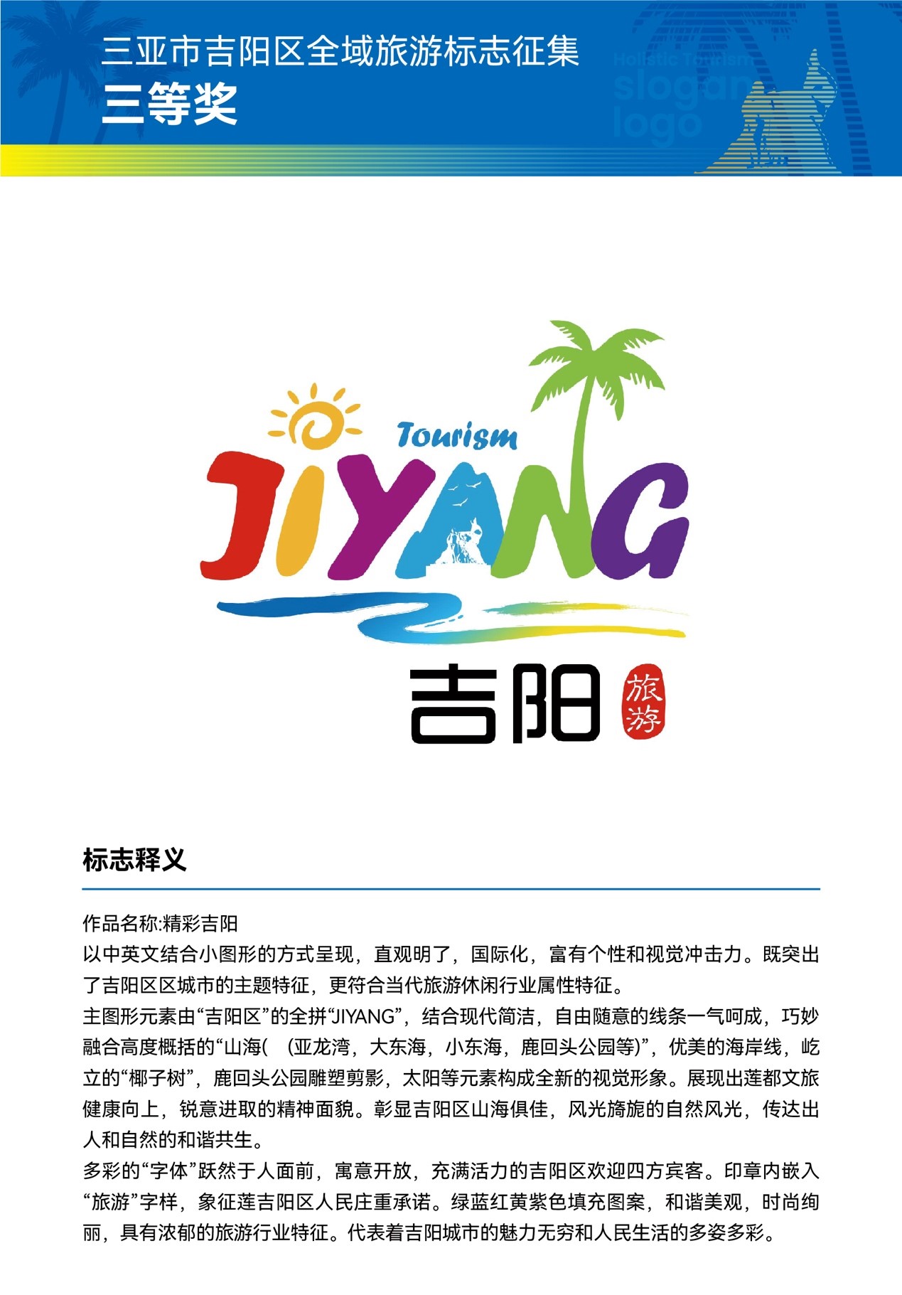 新海南客戶端、南海網、南國都市報11月10日消息(記者 劉麗萍)11月10日,由三亞市吉陽區全域旅游發展工作領導小組主辦的三亞市吉陽區全域旅游LOGO及口號征集評選結果揭曉,LOGO及口號兩個項目各評出1名一等獎、1名二等獎、1名三等獎、3名入圍獎。